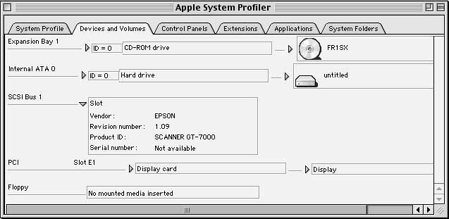 Mac OS 9 recognizes a SCSI device as a FireWire device, through FR1SX. But, if you want to use SIM-API based application, you need to make your device be mounted as a SCSI device. The FR1SX converts FireWire IO request to SCSI IO request and provide SIM-API to the application. The SCSI port is shown up at 'System Profiler' and the attached device is mounted as a SCSI device through FR1SX (See the left image).