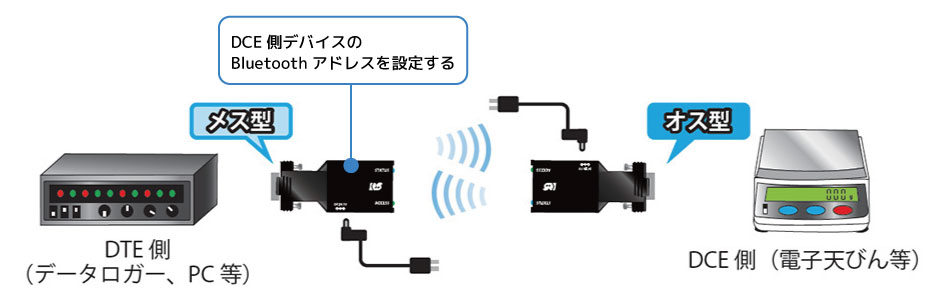 ペアリング済みの2台(RS-BT62とRS-BT62M)がセットになっています。機器間に装着するだけで自動的に無線リンクが確立されるため、シリアルパラメーターの設定のみで、ケーブルの無線化を実現します。設定の変更は、Windows用アプリケーションで行います。