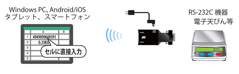 Bluetooth HIDプロファイルに対応。シリアルデータをキーボードイベントに変換して送信するため、Windows、Android、iOS端末で起動している表計算アプリのセルなどへ直接入力できます。