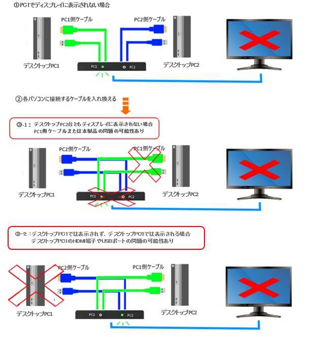 例えば上図のPC1側ケーブルに接続されたデスクトップPC1でのみ表示されない場合、ケーブルを入れ替えた際に、デスクトップPC1で表示され、デスクトップPC2で表示されなくなった場合は、「③-1」の通り、PC1側ケーブルや本製品の異常の可能性が考えられますので修理をご依頼ください。