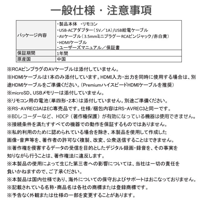 - RS-AVREC3AはEC専用型番です。仕様/梱包内容はRS-AVREC3と同一です。
