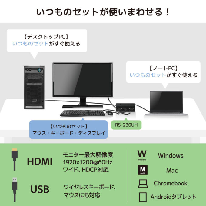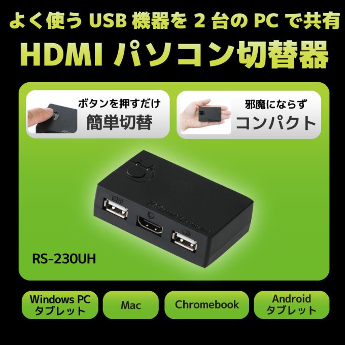 コンパクトなHDMIパソコン切替器 -ディスプレイ、キーボード、マウスを2台のPCで簡単切り替え、Android、Chromebookにも対応!