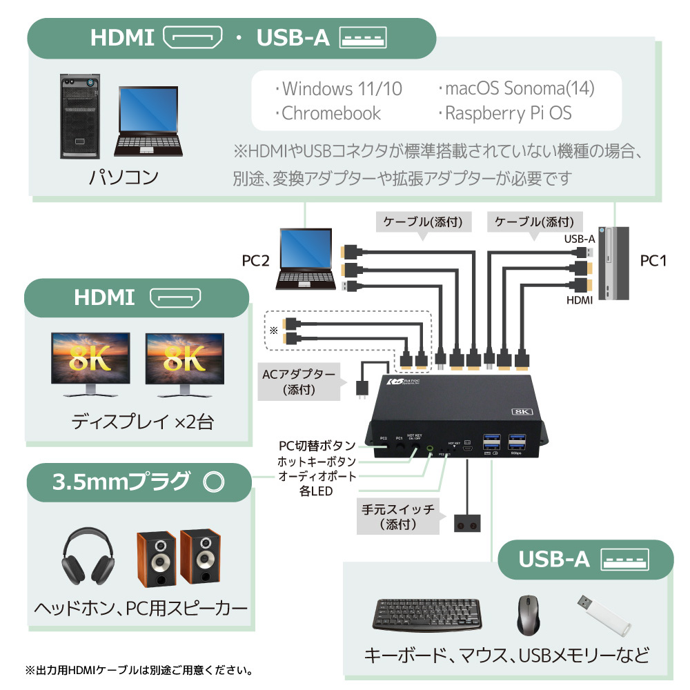 本製品は、HDMI端子とUSB Type-A端子が搭載されたパソコンに対応。異なるOSのパソコン2台(Windows PC、Mac、Chromebook)でも使用でき、ボタンひとつで切り替えることができます。