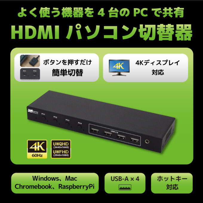 PC4台で周辺機器を一括切替! 4K60Hz対応のHDMIパソコン切替器