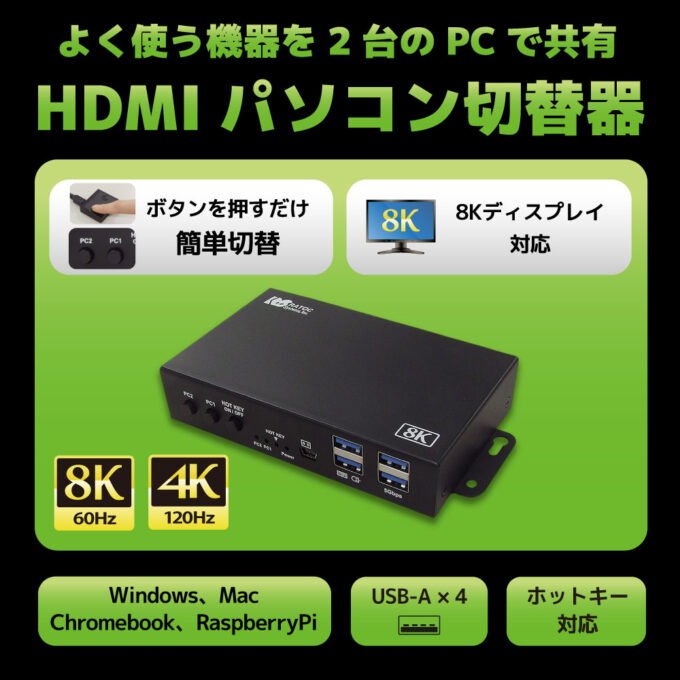 PC2台で周辺機器を一括切替!8K60Hz/4K120Hz対応のHDMIパソコン切替器