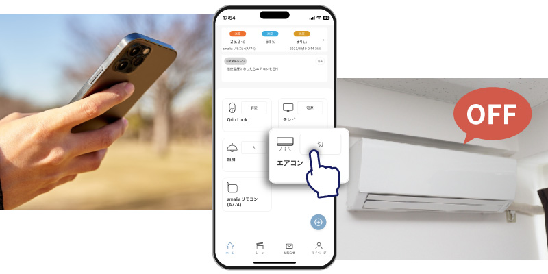 エアコンや照明をつけっぱなしで出かけてしまった時も、外出先からまとめてOFF。帰宅前に暖房をつけておき、あらかじめ部屋を快適にしておくこともできます。