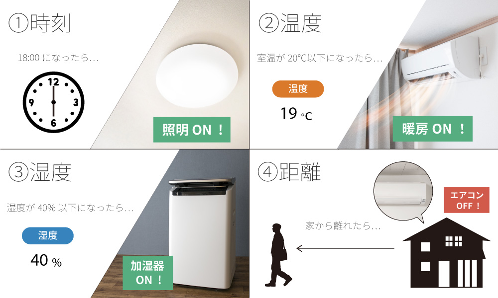 「時刻」「温度」「湿度」「距離(自宅)」の4種類で、登録した操作を自動実行。留守番中のペットの温度管理や、離れて暮らす両親の見守りなどにおすすめです。