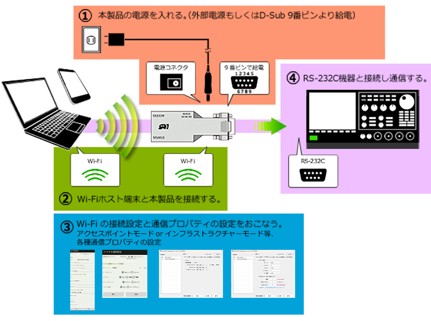 RS-WF62はWi-Fi経由で離れた場所にあるシリアル通信機器を、制御・管理できるシリアルインターフェイスです。コネクタには、EIA/TIA-232-F 規格対応のD-Sub 9Pin を採用しており、RS-232C機器とWi-Fi接続で通信が可能です。