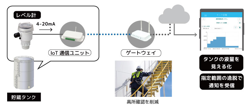 タンク残量や配管圧力をスマホやPCで確認できるようにすることで、高所や危険な場所への巡回点検を大幅に削減します。