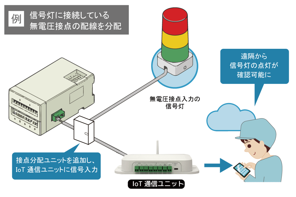 すでに導入済みの信号灯の配線に「接点分配ユニット」を追加し、既存とIoT通信ユニット用に絶縁して分配します。これにより、機器本体には手を加えずデータを取り出すことができます。(詳細についてはご相談ください。)