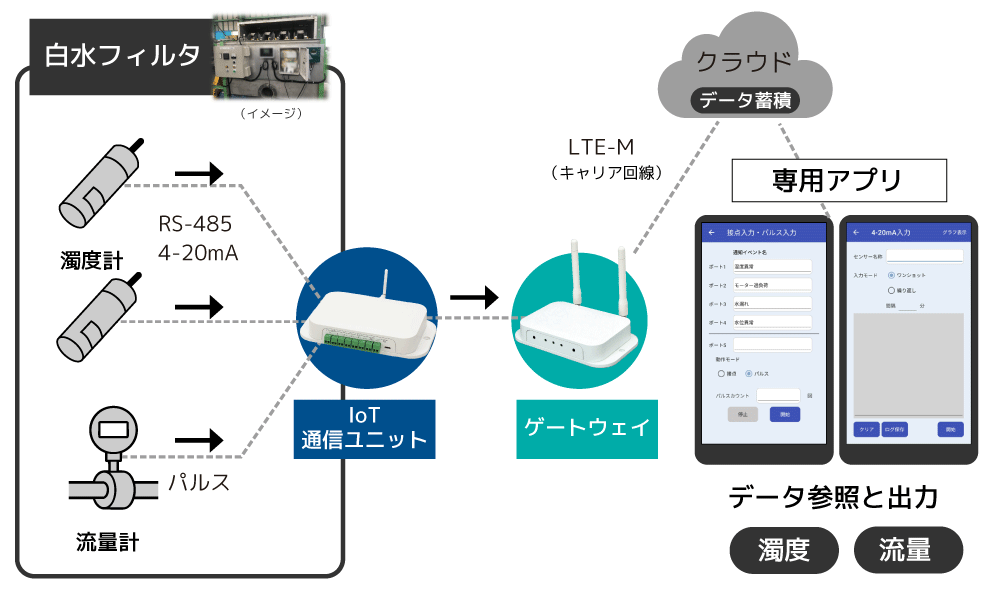 濁度計、流量計を組み合わせ、処理前後での濁度の変化を把握します。IoT化することで現場に足を運んで記録する手間を減らし、デジタルデータは分析に活用。IoT通信キットで数値化し遠隔からいつでも確認できる体制を整え、常時データを蓄積することで、「環境負荷の軽減効果を見える化」します。