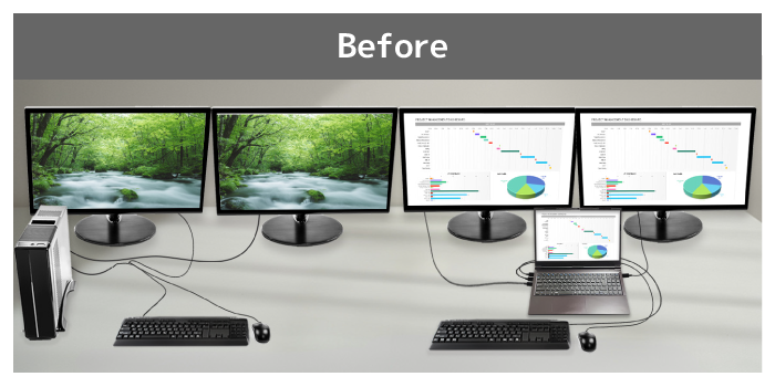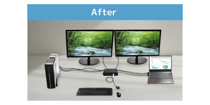 ディスプレイ・マウス・キーボードを2台のパソコンで切り替えて共用。ケーブルを抜き挿しすることなく、ボタンひとつで簡単に切り替えられます。