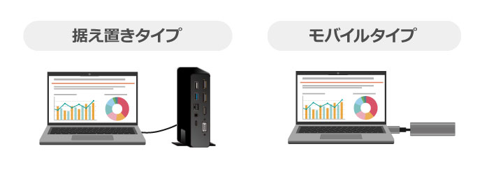 ドッキングステーションには主に「据え置きタイプ」「モバイルタイプ」の2種類があります。