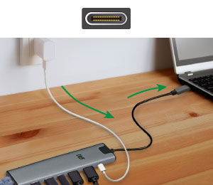 USB-Type-Cが1つしかないノートPCでも、「ドッキングステーションの接続」「給電」の両立が可能です。