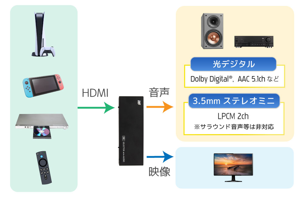 HDMI信号から音声を分離してアンプに出力できます。「映像はテレビ、音声は外部オーディオで楽しみたい」という方に最適です。