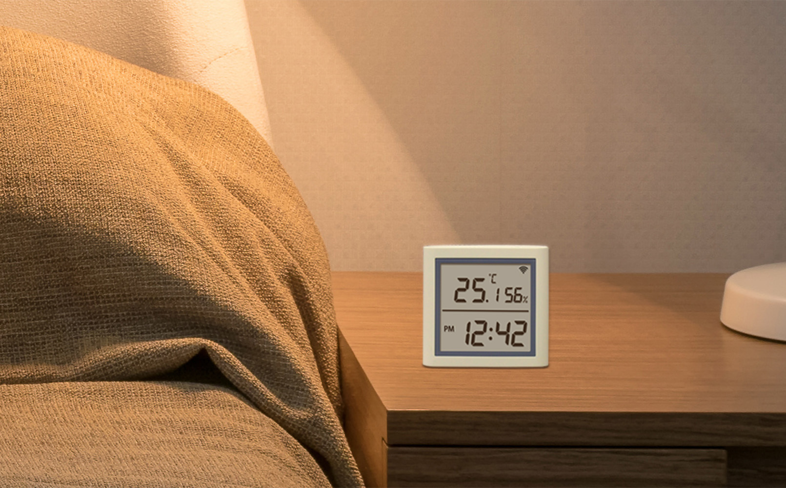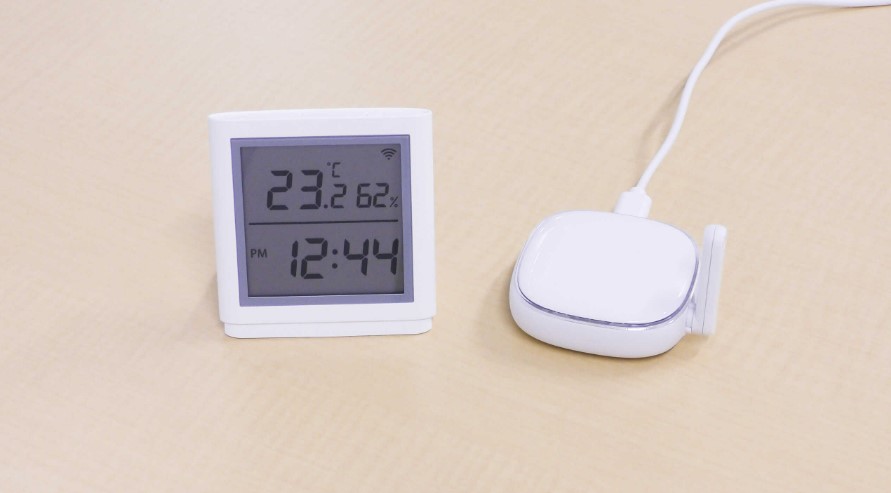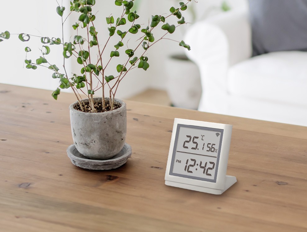 「スマート温湿度計」は、本体に部屋の温度と湿度、時間を常時表示し、さらにスマホアプリから数値を確認できる温湿度計です。