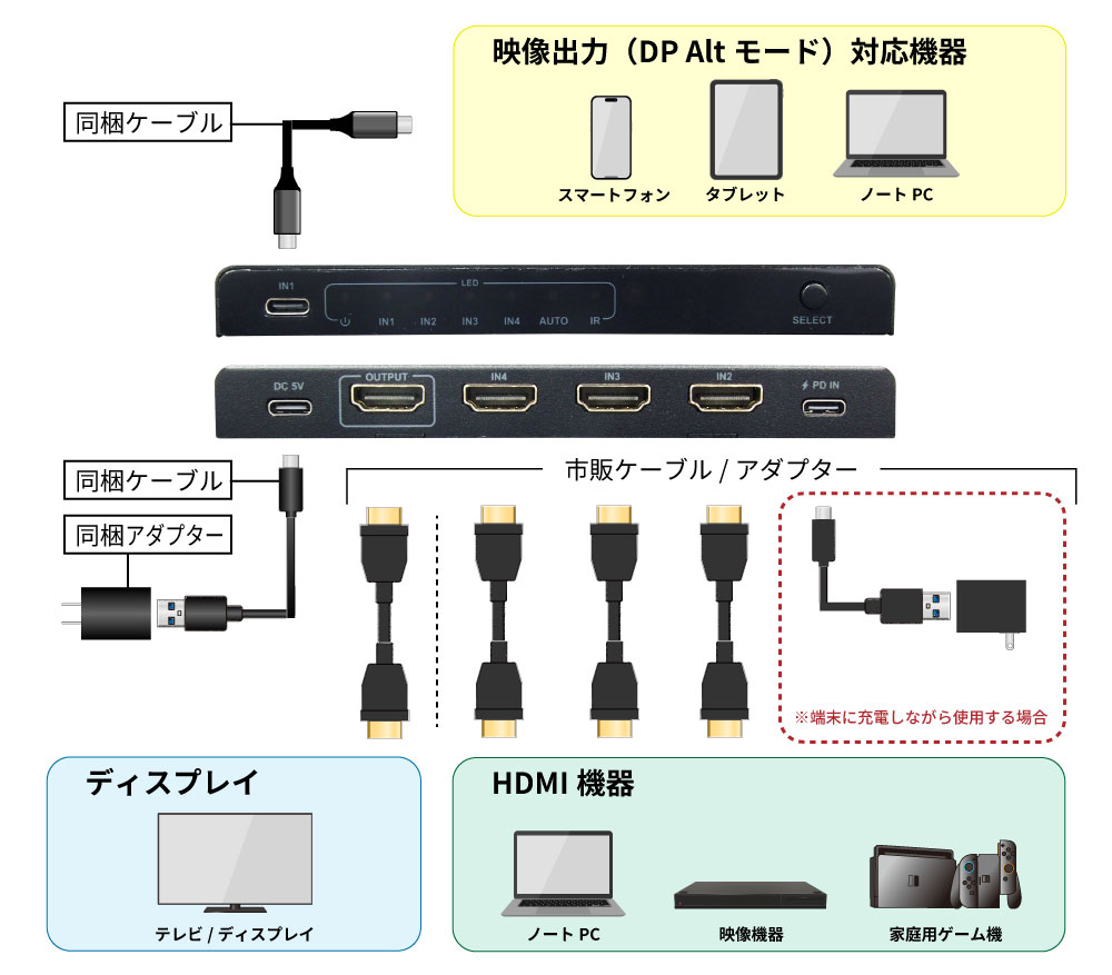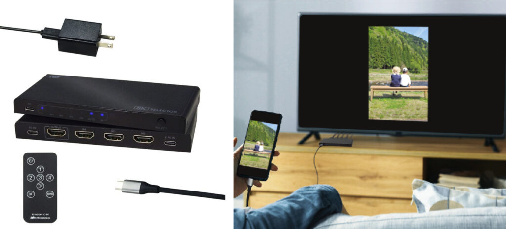 USB Type-C入力ポートを搭載したHDMIセレクター。スマホをセレクタに接続することでゲーム機やレコーダーと切り替えてテレビに表示できます。